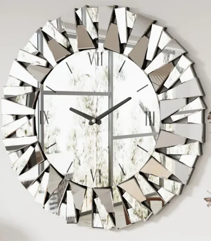 A stunning 80cm sunburst mirror clock with 3D beveled glass, elegant Roman numerals, and silent quartz movement—designed to add instant luxury, brightness, and modern style to any living room, bedroom, hallway, or fireplace space.