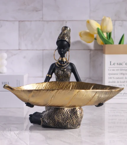 African Girl Holding a Plate Sculpture, Home and Office Decorative Storage Ornament, Vintage Collectible Craft Deskt Decor